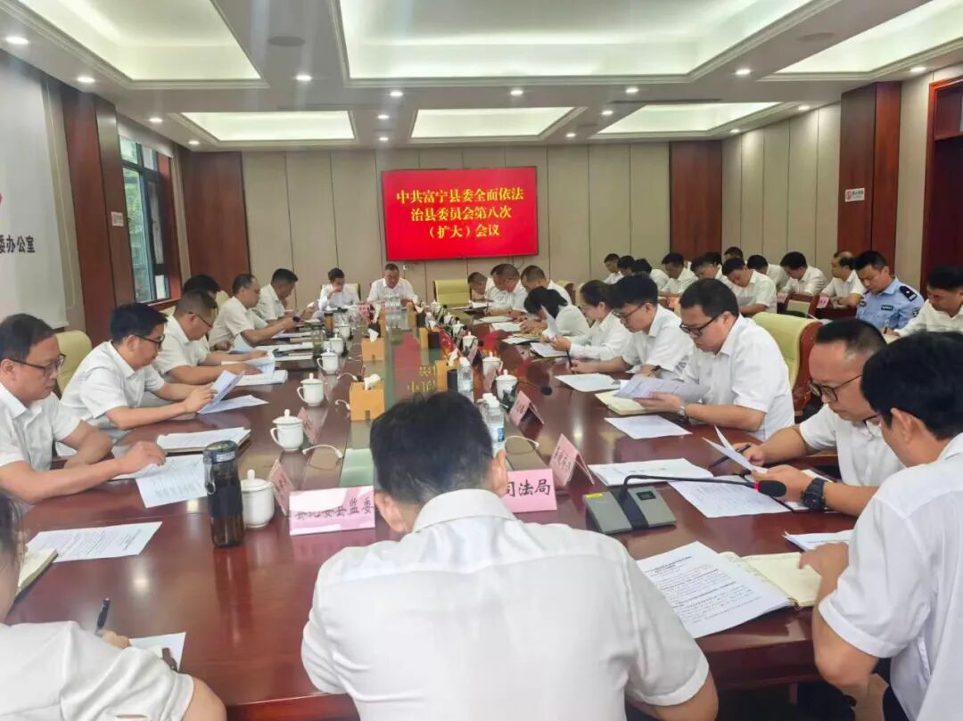 将习近平法治思想纳入“第一议题”、县委理论学习中心组学习内容和党校重点课程,依托媒体平台与普法阵地推动思想入脑入心。压实法治建设第一责任人职责,纳入县委常委会、县政府常务会及各级党委(组)年度专题研究议题,定期召开县委全面依法治县委员会等会议破解重点难点。完善党领导全面依法治县制度机制,调整协调小组及办公室成员并明确职责清单,2023年设立县委全面依法治县委员会办公室秘书股强化保障。健全述法工作机制,汇编党政主要负责人述法报告并召开述法会议8次,24人现场述法压实责任链条。出台《富宁县提升法治建设成效十条措施》,通过年度考核细则、实地调研、工作督察实施动态清单管理,组建督察组开展全覆盖法治督察并督促限时整改问题。